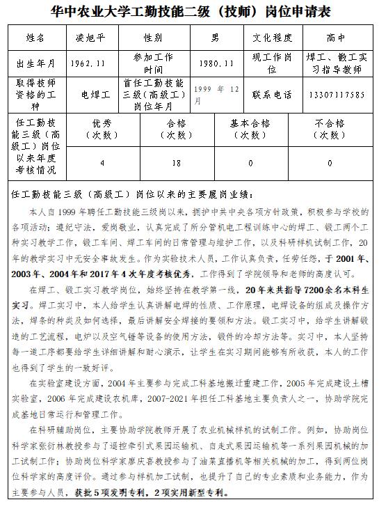 根据校发文件《关于开展工勤技能二级(技师)岗位聘用工作的通知》的要求,经教职工个人申报、述职与民主测评,公司党政联席会议讨论研究决定,推荐凌旭平申报工勤技能二级技师岗位。现对申报材料进行公示。