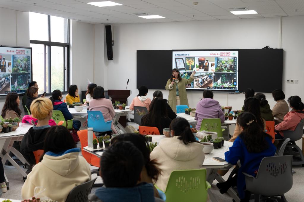 王媛媛从康养园艺理念与触觉体验引申到工程学的生物传感器,从现代插花案例欣赏到软萌可爱的多肉组合盆栽,为大家呈现了一场完美的视觉盛宴。“运用园艺手段可以提高生命质量,减轻工作压力,改善人们身体、心理或精神健康状态。”她建议在场的师生,要利用园艺手段美化空间、愉悦精神,用实际行动创建绿色校园。