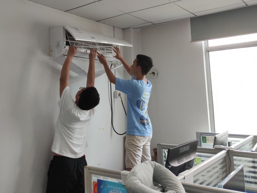 即将毕业留校工作的博士党员王磊正在清洗空调(乔佳郡 摄)