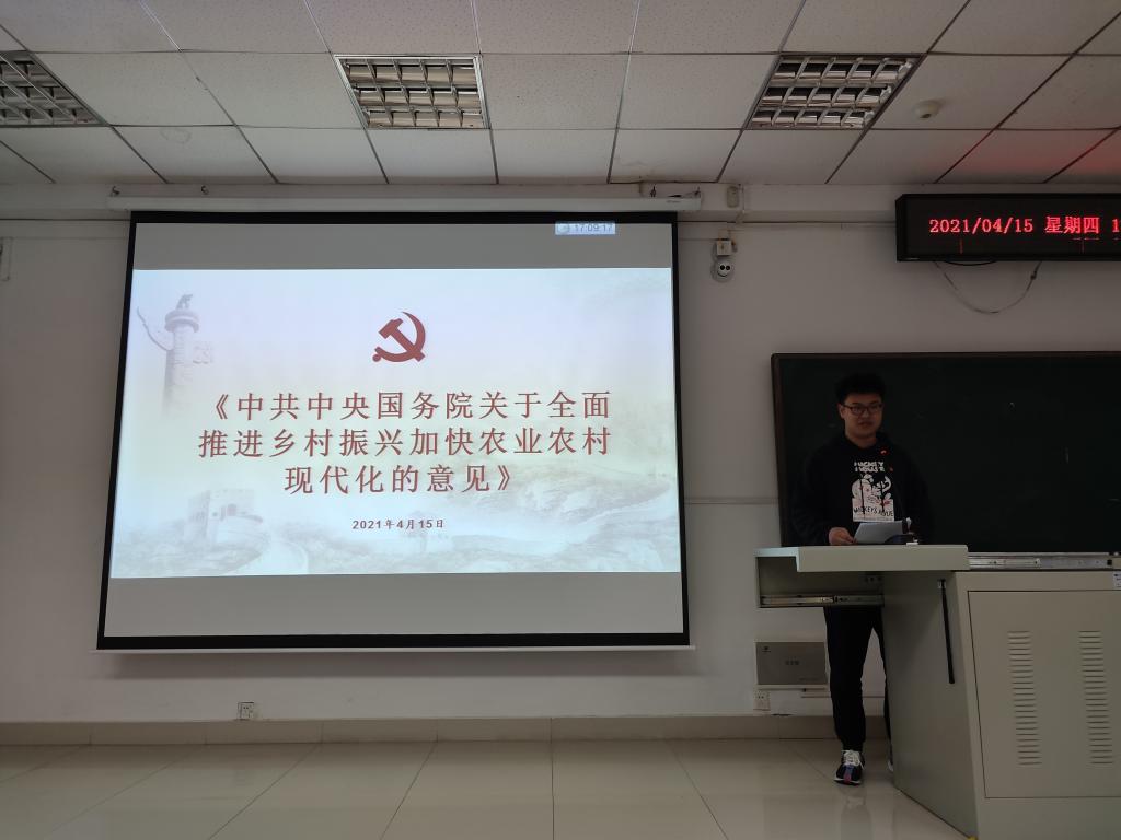 农业生物环境与能源工程研究生第二党支部书记宋竹平同志领学了《中共中央 国务院关于全面推进乡村振兴加快农业农村现代化的意见》。他谈到:“2021年的中央一号文件聚焦‘三农’工作和乡村振兴,明确加快推进农业现代化的七大任务,明确大力实施乡村建设的八大行动,为做好当前和今后一个时期的“三农”工作指明了方向。”他还结合自己的课题内容,柑橘的种植、采摘、加工等环节的装备研发,强调了推进农业现代化的重要意义。